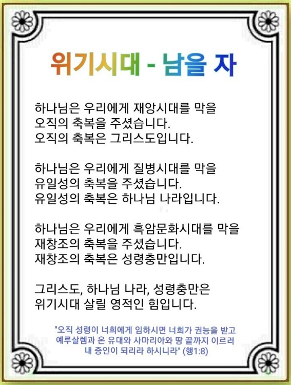하나님이 위기시대의 재앙을 막기 위해 우리를 부르시고 그리스도라는 오직의 축복을 주셨습니다. 예수님은 재앙시대가 찾아오지만 모든 민족에게 복음이 증거된 이후에 끝이 올 것이며(마태복음 24:14), 우리가 재앙이 임할 현장에 증인으로 서게 될 것을 약속하셨습니다(사도행전 1:8). 우리가 시대의 재앙을 막을 이 미션을 가지고 있다면, 하나님은 우리를 통해 반드시 하나님의 일을 이루실 것입니다.