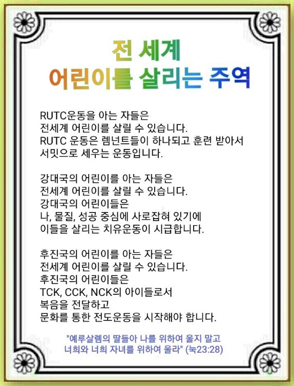 [전도자의 기도] 하나님! 전 세계 어린이를 살리는 주역으로 서게 하옵소서. 전 세계 현장에 RUTC가 세워지게 하시고 Remnant가 일어나게 하옵소서.