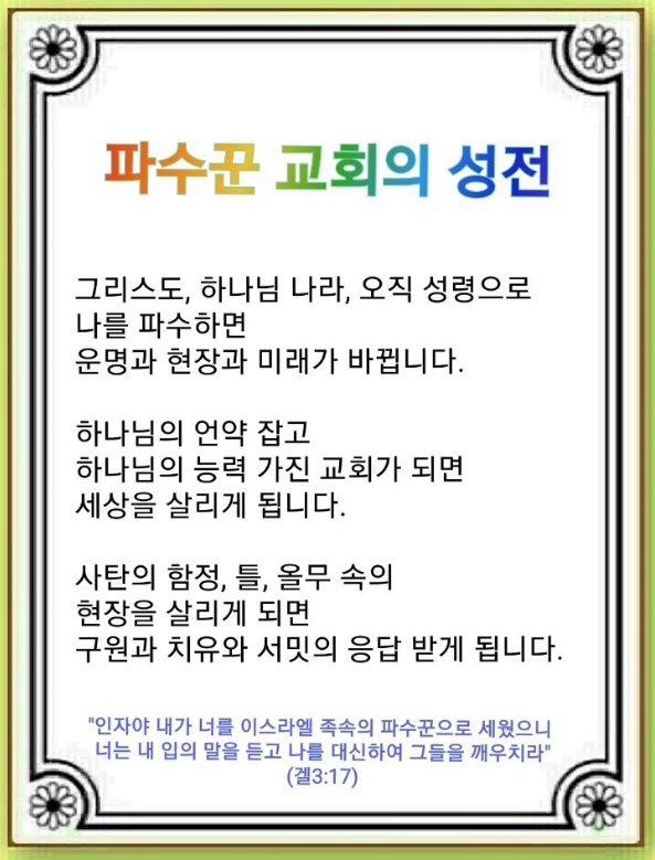 우리는 현장을 살리는 파수꾼입니다. 사람들은 사탄의 함정에 빠지고 사탄의 틀에 갇힌 채 사탄의 올무에 걸려 있습니다. 그들을 건져내는 파수꾼이 되어야 합니다. 그리고 그들을 살릴 수 있는 성전이 필요합니다. 병든 자들이 와서 치유를 받고, 영적으로 어려움을 당하는 자들을 살리며, 237개 나라의 영혼들이 구원을 받아, 후대와 Remnant를 살리는 파수꾼으로 설 수 있는 교회를 만들어야 합니다.