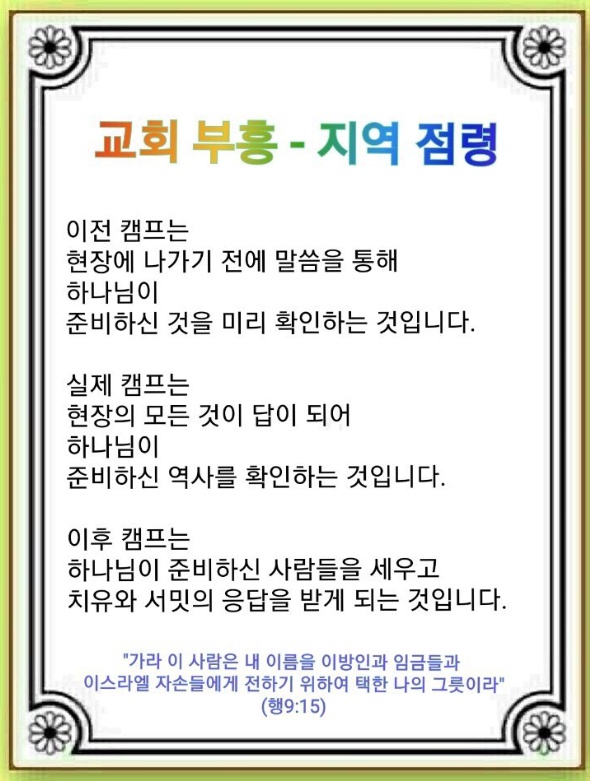 하나님이 준비하신 것을 미리 찾는다면, 지역을 점령하는 실제 캠프가 시작됩니다. 이때부터 모든 사람, 모든 일, 모든 사건이 중요한 답이 됩니다. 우리는 단순한 전도를 하는 것이 아닙니다. 중요한 현장에서 하나님이 준비하신 역사를 확인하는 것입니다(사도행전 13:1~12, 16:16~18, 19:8~20). 이것이 실제 현장에서 우리가 받아야 할 응답입니다.