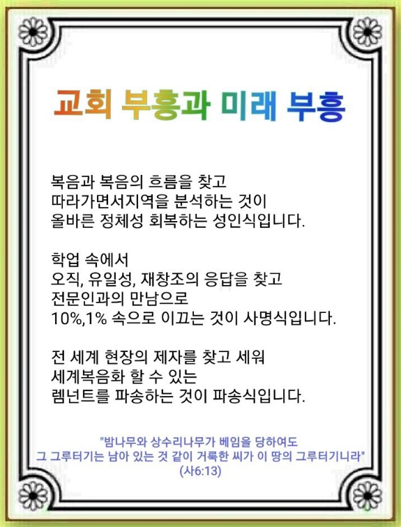 언약의 흐름을 따라가는 사람은 세상을 끌고 갈 무장을 해야 합니다. 앞서가는 학업을 하면서 세상의 흐름을 바꾸는 준비를 하는 것입니다. 이것이 전도와 선교에 쓰임받는 산업의 축복과 Remnant를 키울 세계 선교의 열쇠입니다. 지금부터 미래를 바꿀 지도자 훈련을 시작한다면 파송식의 응답을 받게 됩니다. 그러면 학교 점령을 통한 미래 부흥을 꿈꿀 수 있습니다. 전 세계 대학 현장의 제자를 찾고 세워 세계복음화를 할 수 있는 Remnant를 파송하는 것입니다.