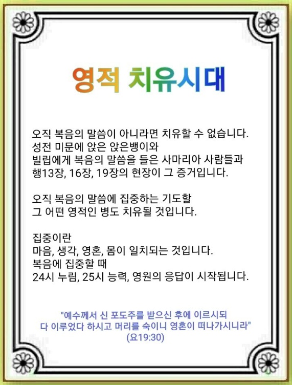 오직 복음에서 나오는 힘, 즉 오직 복음의 말씀이 아니라면 치유할 수 없습니다. 그 증거로 성전 미문에 앉은 앉은뱅이가 예수 그리스도의 복음을 듣고 치유되었습니다(사도행전 3:1~12). 또, 일심으로 전한 복음의 말씀과 그리스도가 영혼에 깊이 뿌리내려 귀신이 떠나가고 중풍병자와 못 걷는 사람이 낫는 역사가 있었습니다(사도행전 8:4~8). 하나님의 말씀을 전하는데 영적 병에 걸린 무속인이 치유받고(사도행전 13:1~2), 3일 간 그리스도의 이름을 집중적으로 전하자 귀신이 즉시 쫓겨나기도 했습니다(사도행전 16:16~18). 그뿐만 아니라 2년간 하나님의 말씀을 증거하자 한 지역이 치유되는 놀라운 역사가 일어났습니다(사도행전 19:8~20).