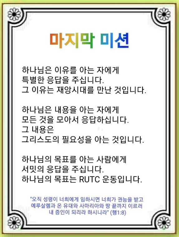 하나님의 목표를 아는 사람에게 서밋의 응답을 주십니다. 첫 번째 하나님의 목표는 복음을 완전히 각인시키는 제1 RUTC운동입니다(신명기 6:4~9). 두 번째 목표는 학교를 살리는 제2 RUTC운동입니다. 세 번째 목표는 현장의 영혼들을 치유하고 서밋으로 세우는 제3 RUTC운동입니다. 이때 아무도 할 수 없는 것을 하게 되는 제4 RUTC운동에 하나님이 응답하셔서 이 복음운동을 지속하는 제5 RUTC운동의 축복을 받게 됩니다.