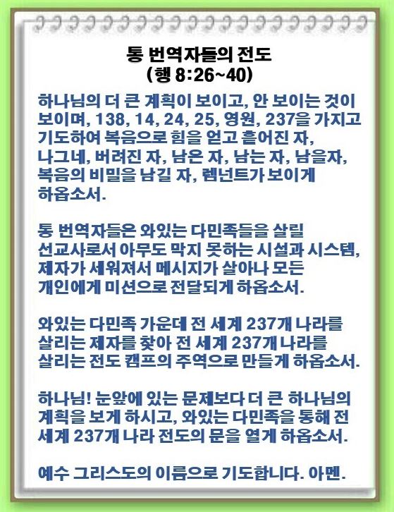 [전도자의 기도] 하나님! 눈 앞에 있는 문제보다 더 큰 하나님의 계획을 보게 하옵소서. 와있는 다민족을 통해 전 세계 237개 나라 전도의 문을 열게 하옵소서.
