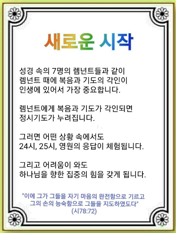 이처럼 Remnant에게 복음과 기도가 각인되면 정시기도가 쉬워집니다. 정시기도를 누리는 가운데 어떤 상황 속에 있어도 복음과 기도가 24시 누려지고, 25시와 영원의 응답이 체험됩니다. 그러면 아무리 어려움이 와도 여호와를 향해 집중할 수 있는 힘을 가지게 됩니다. 이것이 집중기도의 힘입니다.