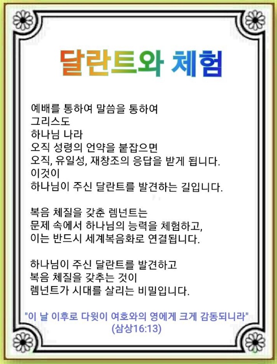 [전도자의 기도] 하나님! 하나님이 주신 달란트를 발견하고 복음의 체질을 갖추게 하옵소서. 오직 복음과 기도와 하나님 능력을 체험하여 시대를 살리게 하옵소서.
