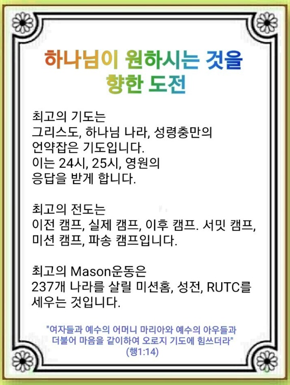 우리의 모든 현장을 미션홈으로 만들면 됩니다. 교회는 문을 닫고 우상 신전은 부흥하는 이 시대에 우리는 전 세계 237개 나라를 살릴 성전을 지어 영적 전쟁을 하는 것입니다. 그리고 모든 지역에 RUTC를 세워 시대에 증거를 나타낼 Remnant를 키워야 합니다. 하나님의 약속은 바뀌지 않습니다. 하나님이 우리에게 주신 언약은 영원하고, 반드시 성취됩니다. 이 언약을 붙잡고 오늘 도전하면 됩니다.