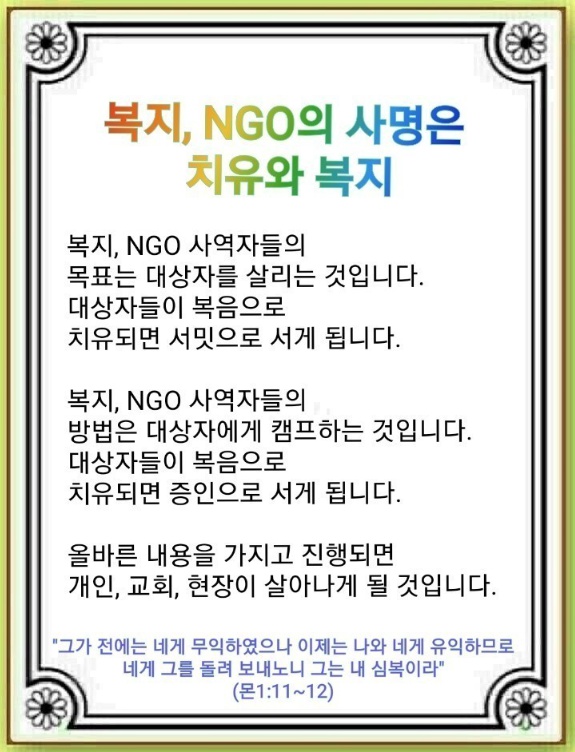 복지, NGO의 사명은 치유와 복지(몬1:1~25)