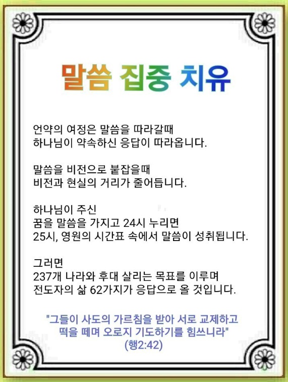 마지막으로 하나님의 목표를 우리의 것으로 붙잡으면 됩니다. 전 세계 237개 나라와 후대를 살리는 것이 우리의 목표이며 그 속에 모든 것이 들어있습니다. 이렇게 정확한 말씀만을 붙잡아 집중 치유가 일어나면, 전도자의 삶 62가지가 응답으로 나타날 것입니다.