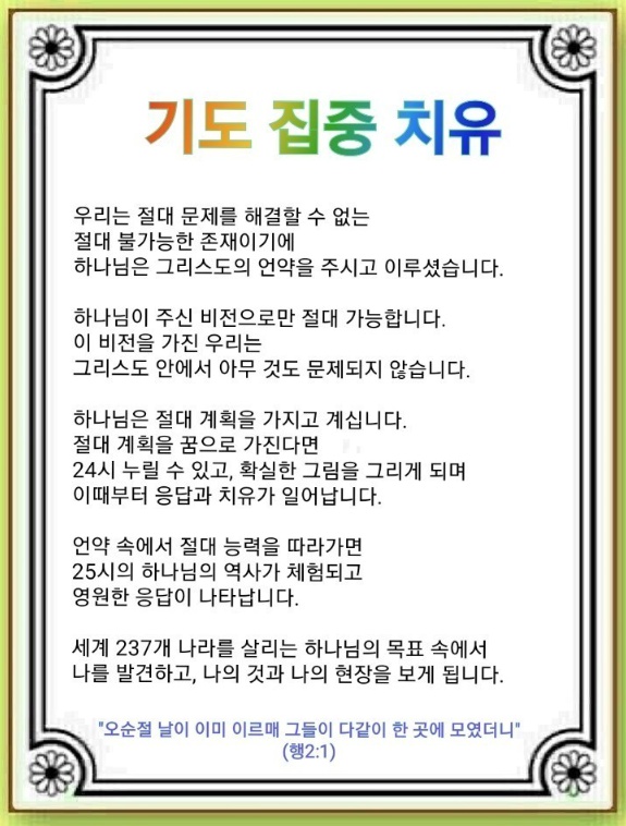 하나님은 우리를 향한 정확한 계획을 가지고 계십니다. 하나님이 주신 확실한 꿈을 가진다면 24시 누릴 수 있고, 확실한 그림을 그리게 됩니다. 이때부터 응답과 치유가 일어납니다.
