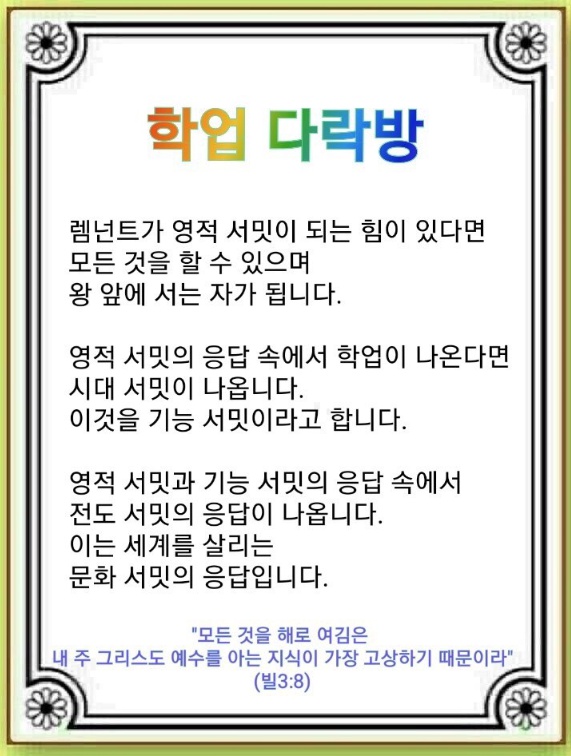 미션홈에서 해야 할 다락방이 있습니다. 세상에서의 성공을 배설물로 여길 Remnant를 키우는 것입니다. 이 일에 가장 중요한 부분이 달란트입니다. 달란트는 하나님이 주시는 것이기 때문에 말씀, 기도, 전도의 흐름 속에서만 찾을 수 있습니다. 그리고 달란트의 여정(7가지 서밋의 길) 속에서 말씀의 흐름과 하나님이 사용하신 사람을 보고, 예배에 성공해서 오직, 유일성, 재장조의 능력을 찾아 공부하는 것입니다. 이때 하나님이 만드신 나, 하나님이 주신 나의 것, 나의 현장이 확정됩니다. 그렇다면 Remnant에게 가르쳐야 할 것은 무엇일까요?
