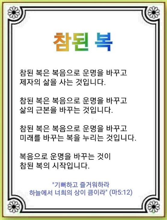유대인들이 세상 사람들과 똑같은 수준의 착각을 했습니다. 그런데 문제는 기독교인들도 그렇게 착각을 하고 있다는 것입니다. 참된 성공은 싸워서 이기는 것이 아니라 싸우지 않고도 이기는 것입니다. 참된 회개는 복음을 바르게 알고 하나님께 돌아오는 것입니다. 참된 복은 건강과 물질과 명예와 자녀가 잘 되는 것이 아니라 하나님의 복을 받은 사람이 되는 것입니다. 그렇다면 예수님이 말씀하신 참된 복은 무엇일까요?