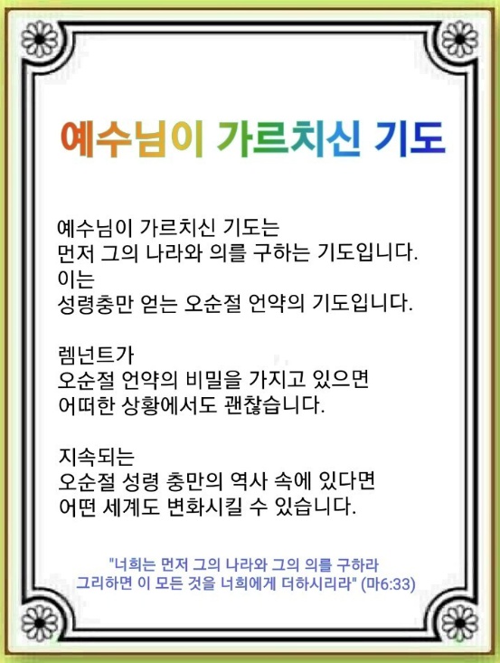 하나님이 그리스도를 보내셔서 우리를 모든 흑암에서 건져내셨습니다(유월절). 우리의 배경은 하나님 나라이며, 우리가 가는 곳마다 주의 사자를 보내셔서 하나님 나라를 이루십니다(수장절). 이 사이에도 성령이 우리와 함께하셔서 능력으로 역사하십니다(오순절). 이 사실을 알 때 기도가 얼마나 중요한지 알게 되고 기도가 되어집니다. 그렇다면 예수님이 가르치신 기도는 무엇일까요?