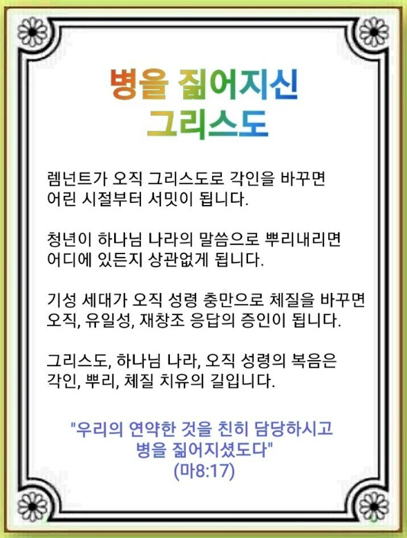 [전도자의 기도] 하나님! 오직 그리스도, 하나님 나라, 성령 충만으로 잘못 각인된 것, 뿌리내린 것, 체질된 것을 바꾸게 하옵소서. 모든 질병을 고치는 영적 시간을 가지게 하옵소서.