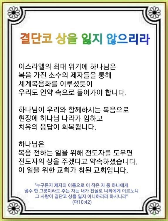 하나님은 복음 전하는 일을 위해 전도자를 도우면 전도자의 상을 주겠다고 약속하셨습니다. 의인의 이름으로 의인을 도우면 의인의 상을, 제자의 이름으로 제자를 도우면 제자의 상을 주겠다고 약속하셨습니다. 하나님은 복음, 전도, 선교를 회복하기 원하시기 때문입니다. 이 일을 위해 하나님이 찾고 쓰시는 교회, 사탄이 두려워하고 흑암 권세가 스스로 도망가는 교회, 모든 곳에 빛을 비추는 교회가 바로 우리 교회가 받을 참된 교회의 모습이며 응답입니다.