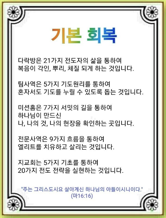 모든 성도가 다락방에서 21가지 삶을 확실히 해야 합니다. 그 중 그리스도, 하나님 나라, 오직 성령의 언약을 천명, 소명, 사명으로 받아 당연, 필연, 절대적으로 전해야 합니다. 이 일에 일심, 전심, 지속할 때 24시, 25시, 영원한 역사를 체험하게 되고, 각인, 뿌리, 체질이 바뀌게 됩니다. 이때 증거로 나오는 것이 오직, 유일성, 재창조의 축복입니다.