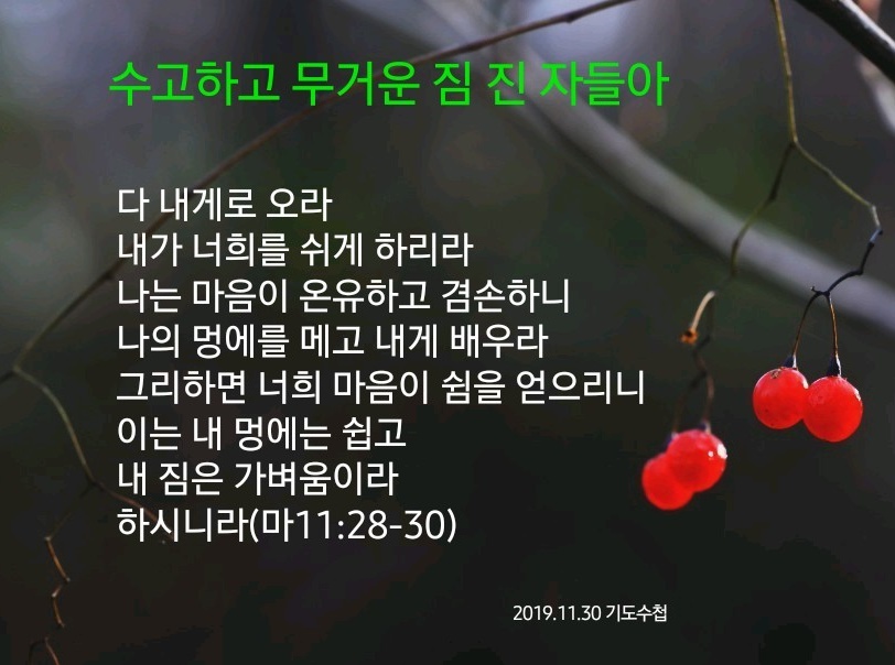수고하고 무거운 짐 진 자들아 다 내게로 오라 내가 너희를 쉬게 하리라 나는 마음이 온유하고 겸손하니 나의 멍에를 메고 내게 배우라 그리하면 너희 마음이 쉼을 얻으리니 이는 내 멍에는 쉽고 내 짐은 가벼움이라 하시니라(28~30)