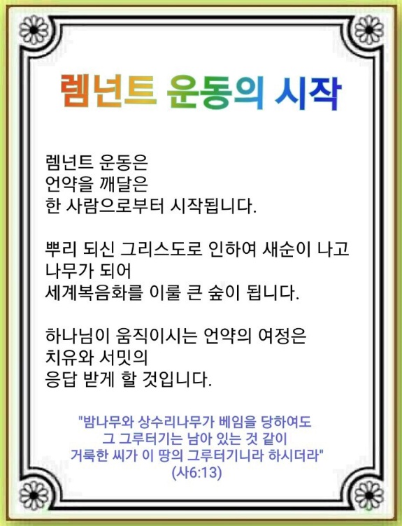 Remnant 운동은 언약을 깨달은 한 사람으로부터 시작됩니다. 이 한 사람은 보좌에 앉으신 주님과 배경을 보고 아는 사람입니다. 또 온 땅에 여호와의 영광이 나타난 것을 본 사람이며 천사들이 큰 능력으로 역사하는 것을 체험한 사람입니다. 마침내 Remnant들이 세상의 주역으로 서는 모습을 보게 될 것입니다. 이 일을 준비할 사람이 필요합니다.