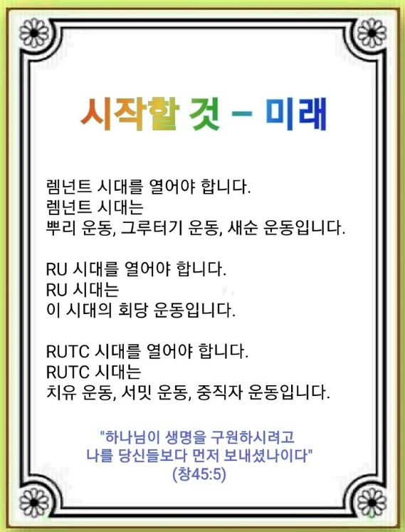 RUTC 시대에 중요한 운동 3가지가 있습니다. 첫째, 몸과 마음은 물론, 정신을 넘어 영혼까지 병든 이 시대를 치유할 치유 운동입니다. 둘째, Remnant가 일어나 이 시대를 치유할 서밋 운동입니다. 셋째, 중직자 운동을 시작해야 합니다. 중직자는 교회를 살리는 비밀결사대, 후대를 살리는 Remnant Ministry, Mason 전쟁을 할 Holy Mason으로 부름 받았기 때문입니다. 이 그림을 가지고 언약의 여정을 출발하면 됩니다.
