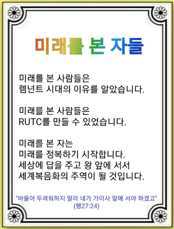 미래를 본 사람들은 미래를 만들 수 있었습니다. 미래를 만드는 것은 곧 RUTC(Remnant Unity Training Center)를 세우는 것입니다. Remnant는 복음의 뿌리와 베임을 당하여도 남아있는 그루터기, 그리고 그루터기에서 나는 새순을 뜻합니다. 이들이 모여 합숙하며 공동체에서 WITH, Immanuel, Oneness의 축복을 누리는 훈련을 받아 영적 서밋으로 서는 곳이 RUTC입니다. 이는 성경을 요약한 단어이기도 합니다.