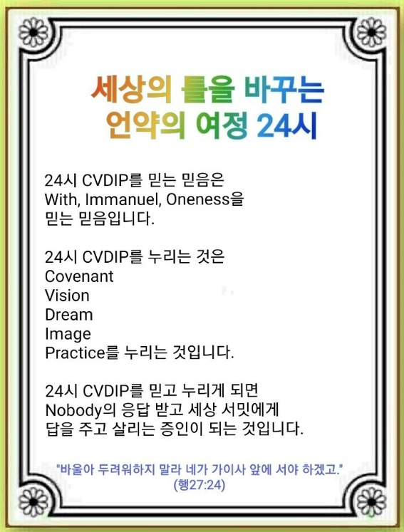 하나님은 어떤 경우에도 우리와 함께하십니다(WITH). 그리고 임마누엘로 우리와 함께하십니다(Immanuel). 어떤 상황에 있어도 모든 것을 합력하여 응답을 주십니다(Oneness). 이것이 바로 24시간 CVDIP를 믿는 믿음입니다. 이 언약을 확실히 가지고 지금부터 언약의 여정 속으로 들어가면 됩니다. 하나님이 주신 언약의 여정 24시 속에서 업과 학업, 모든 것을 한다면 하나님은 세상을 바꾸는 축복을 허락하십니다.