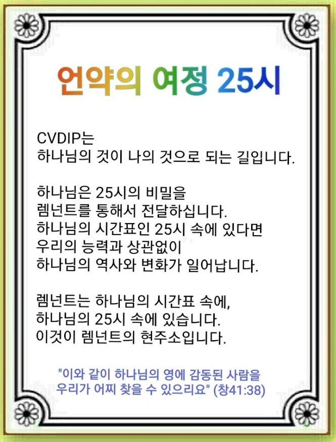 하나님은 25시의 비밀을 Remnant를 통해서 전달하십니다. 성경의 Remnant 역시 하나님이 주신 CVDIP를 24시간 누림으로 승리했고, 영적 리더로 왕과 지도자에게 답을 주었습니다. 이것은 완전히 하나님이 만드신 사건이었습니다. 우리 역시 하나님의 시간표인 25시 속에 있다면 이때부터 하나님의 역사가 일어납니다. 우리의 능력과 상관없이 변화가 일어납니다.