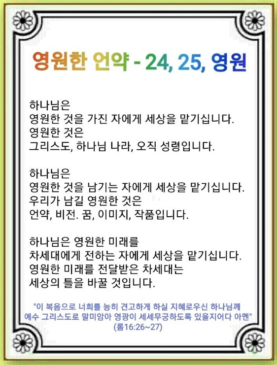 [전도자의 기도] 하나님! 영원한 하나님의 언약 속에서 있게 하시고, 언약을 후대에게 전달하는 증인이 되게 하옵소서.