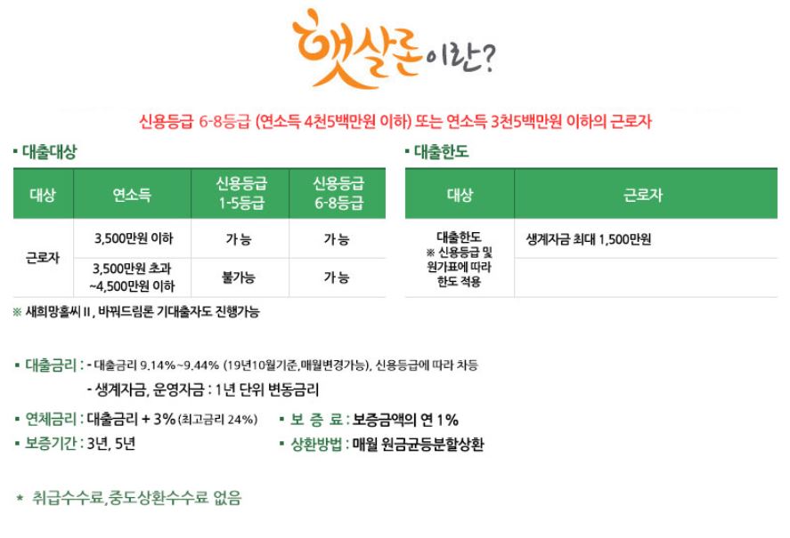 ㆍ수수료 : 없음 (단, 햇살론은 대출기간에 따라 보증보험료 발생)