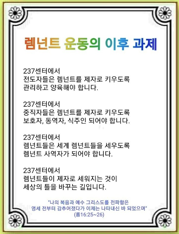 전도자들이 237센터를 통해서 Remnant를 관리하고 양육해야 합니다. 예수님은 제자를 삼으실 때 그들을 불러 처음부터 함께 기도하시고, 함께 전도하셨으며, 함께 훈련하셨습니다. 예수님처럼 많은 일을 하는 것보다 제자 한 명을 남기는 것이 가치 있는 인생입니다. 우리의 Remnant를 제자로, 사역자로, 선교사로 키워야 합니다.