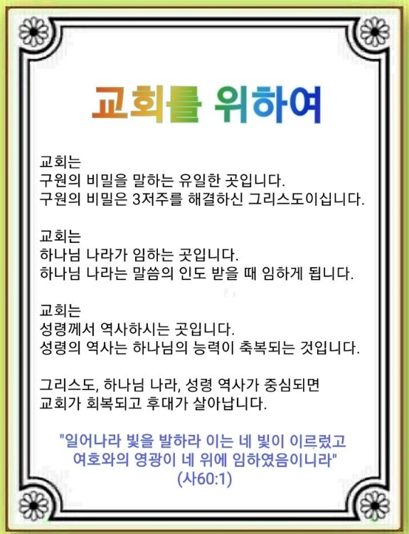 [전도자의 기도] 하나님! 하나님이 주신 3가지 축복으로 무너진 교회를 세우고 후대를 살리게 하옵소서. 하나님 자녀가 일어나 교회를 위하여 빛을 발하여 영적 전쟁에서 승리하게 하옵소서.