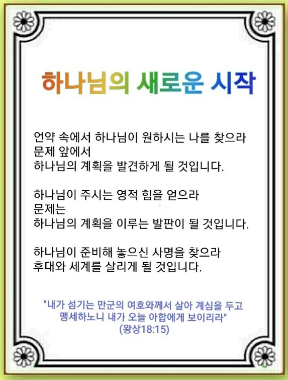 미국의 교회가 문을 닫고 있고, 대형 교회의 목사님들조차 무너져 가고 있습니다. 교회 안에는 복음이 아닌 사상이 들어오고 있으며 현장은 마약 등 중독 문제가 심각합니다. 이때 우리는 하나님의 중요한 메시지를 붙잡고 하나님과 새로운 시작을 해야 합니다. 갈멜산 전투 후 낙심한 엘리야를 찾아오신 하나님은 새로운 언약과 절대 계획을 보여주셨습니다. 오늘 나를 향한 하나님의 절대 계획은 무엇일까요?