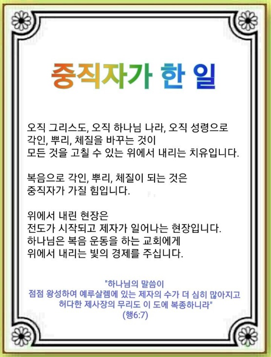절대 불가능을 절대 가능으로 바꾸는 언약을 붙잡은 자들이 마가다락방에 모여 오로지 기도에 힘썼습니다. 이들은 오직 그리스도로 각인된 것을 바꾸었습니다. 오직 하나님 나라로 뿌리내려 잘못된 뿌리를 바꾸었습니다. 오직 성령으로 멸망 받을 수밖에 없는 체질을 완전히 바꾸었습니다. 이것이 바로 모든 것을 고칠 수 있는 위에서 내리는 치유입니다.
