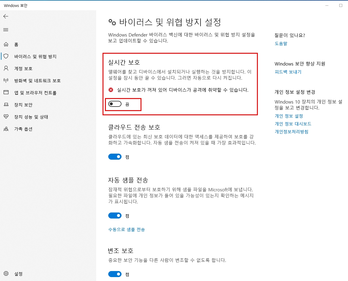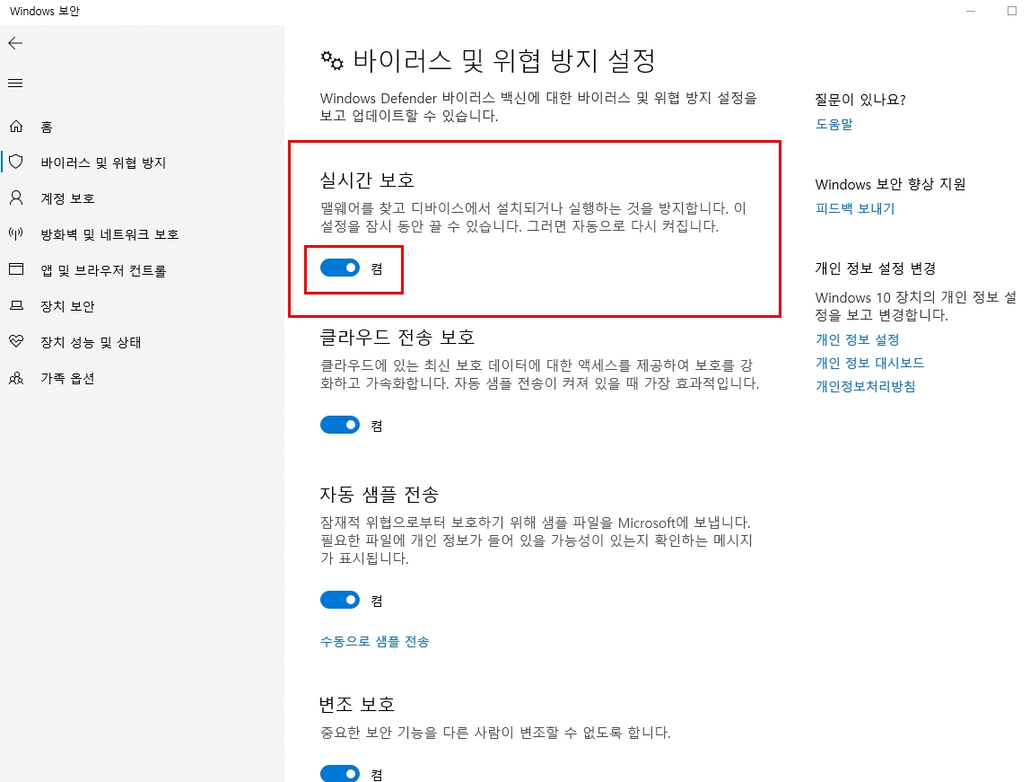 그럼 다시 바이러스 및 위협 방지 설정에서 실시간 보호 텝을 원위치 시킵니다.