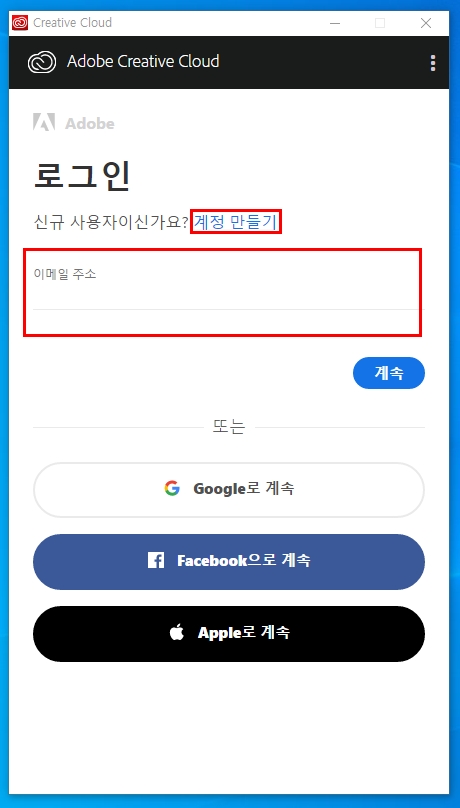 adobe Creative Cloud 설치화면에서 어도비 아이디를 넣고 계속 비번을 넣고 계속