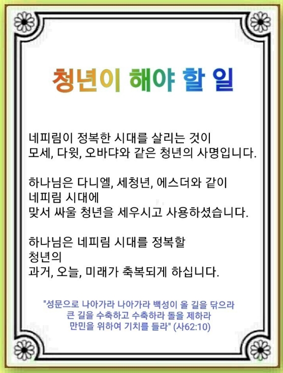 네피림이 정복한 시대를 살려야 합니다. 이것이 청년의 사명입니다. 네피림은 시대마다 강대국을 정복했습니다. 하나님은 모세를 세워 네피림이 정복한 애굽에서 이스라엘 민족을 구하셨습니다(출애굽기 5:1~12:46). 다윗은 골리앗이 다곤 신의 이름으로 자신을 저주하자, 만군의 여호와의 이름으로 나아가 승리했습니다(사무엘상 17:1~47). 또, 오바댜 같은 청년 한 명이 일어나 네피림이 정복한 시대를 바꾸게 되었습니다(열왕기상 18:1~13).