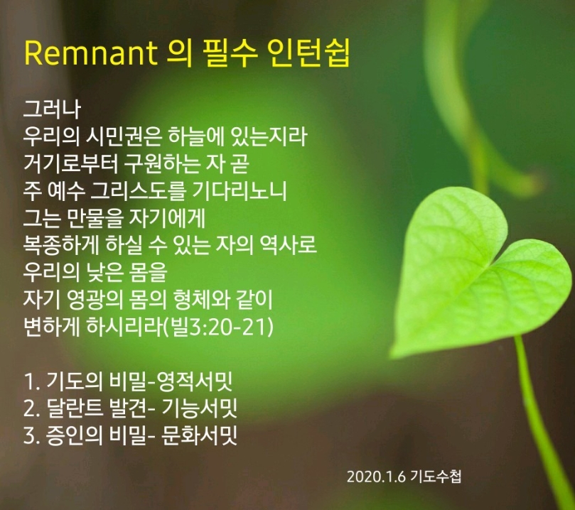 Remnant는 오직 그리스도의 증인입니다. 언제나 어떤 상황에서도 기도가 되는 유일한 행복을 누렸습니다. 세상이 바라고 친구들이 원하는 전문성을 추구하지도 않습니다. 나는 하나님이 주신 달란트를 발견하는 재창조의 증인입니다. 그것이 나를 부르신 하나님의 이유입니다.