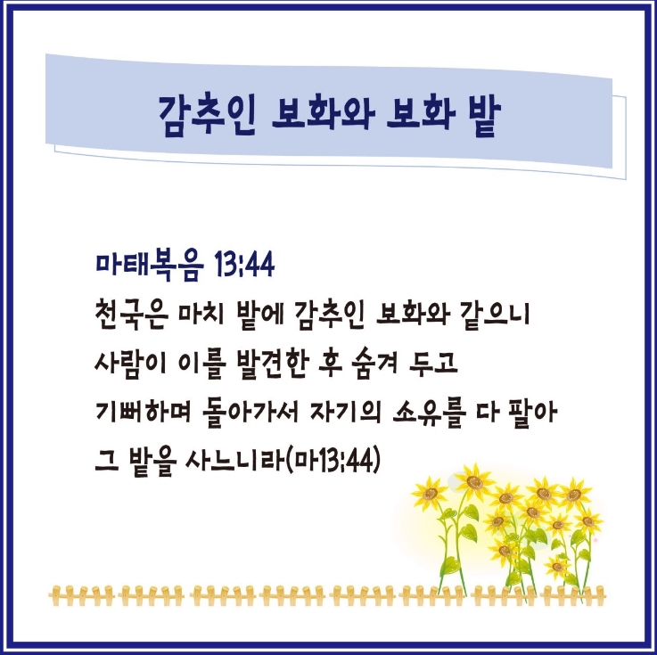 천국은 마치 밭에 감추인 보화와 같으니 사람이 이를 발견한 후 숨겨 두고 기뻐하며 돌아가서 자기의 소유를 다 팔아 그 밭을 사느니라