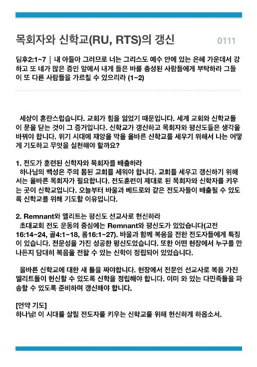 목회자와 신학교(RU, RTS)의 갱신(디모데후서 2:1~7)