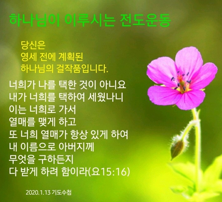 너희가 나를 택한 것이 아니요 내가 너희를 택하여 세웠나니 이는 너희로 가서 열매를 맺게 하고 또 너희 열매가 항상 있게 하여 내 이름으로 아버지께 무엇을 구하든지 다 받게 하려 함이라