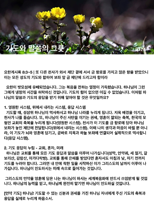 | 전도에 대한 중요한 응답(사도행전 1:3)-기도수첩 (0) | 2020.01.25 |
