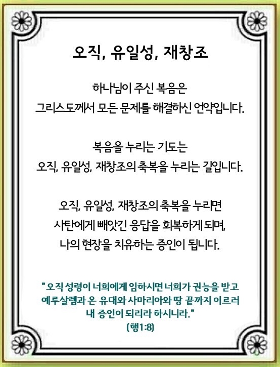 하나님은 아무도 빼앗아갈 수 없는 복음을 주셨습니다(요19:30). 예수 그리스도께서 모든 문제를 해결하셨기에 오직 언약만 붙잡고 기다리면 유일한 응답이 옵니다. 그 모든 과정이 재창조의 역사를 위한 하나님의 방법입니다. 동시에 복음을 누리는 기도를 통해서 영적 축복(오직)과 하나님의 소원(유일성)과 나의 천명(재창조)이 연결되는 전무후무한 응답을 찾아 누릴 수 있습니다.