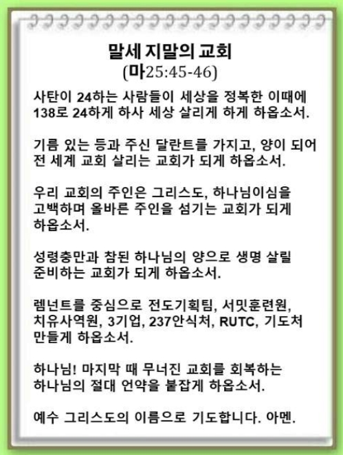 그리스도, 하나님 나라, 오직 성령 충만(행1:1, 3, 8)의 언약을 붙잡은 나에게 무너지는 교회를 살리는 교회라는 절대 언약을 주셨습니다. 교회 안에 기름 없이 빈 등을 가진 자(마25:1~13), 달란트를 묻어두고 복음에 관심이 없는 자(마14~30), 분쟁을 일으키는 염소와 같은 자들이 있습니다(마30~33). 그러므로 올바른 주인을 섬기는 교회(마25:13, 18, 34)와 생명 살릴 준비하는 교회라는 언약을 붙잡아야 합니다.