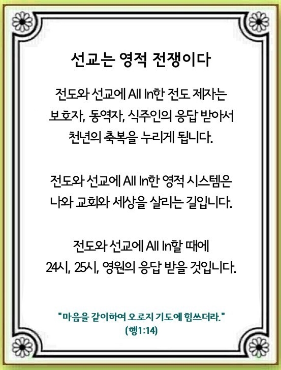 전도와 선교에 모든 것을 걸면 나의 노력과 상관없이 참된 치유와 능력과 서밋의 축복이 나타납니다. 그 응답 속에서 나의 24시, 하나님의 25시와 영원한 역사로 말미암아 전 세계 나라와 열방이 살아납니다. 하나님은 선교에 24시 All In하는 현장으로 나를 부르셨습니다.