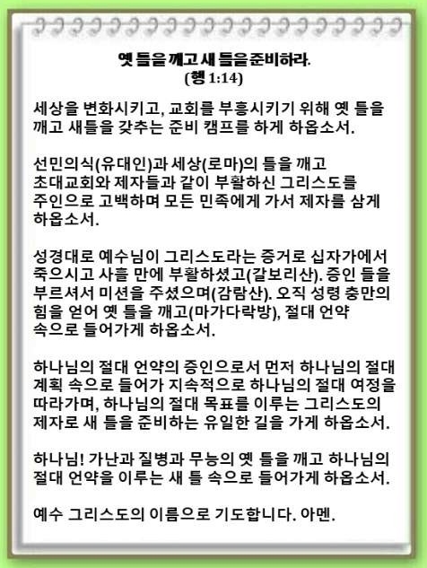 [언약 기도] 하나님! 가난과 질병과 무능의 옛 틀을 깨고 하나님의 절대 언약을 이루는 새 틀 속으로 들어가게 하옵소서.