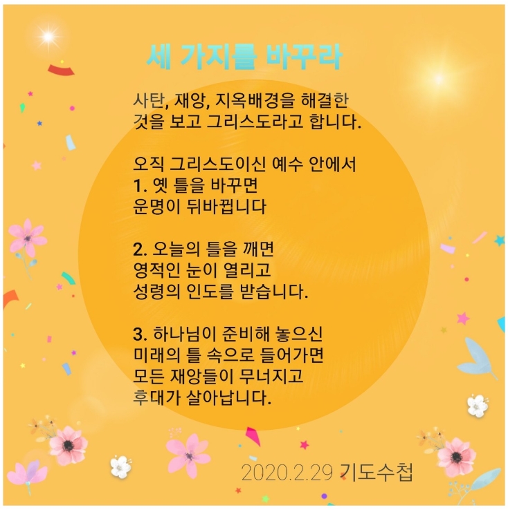 예수님의 주된 사역은 병든 자를 치유하신 것이었습니다. 그리스도의 능력으로 운명을 바꾸고, 질병에 묶일 수밖에 없는 옛 틀을 깨뜨려 주신 것입니다. 이처럼 사탄, 지옥, 재앙 문제를 해결하신 그리스도를 나의 24시 속에서 어떻게 누릴 수 있을까요? 사람과 현장을 살리기 위해 예수 그리스도 안에서 바꿀 수 있는 세 가지는 무엇일까요?