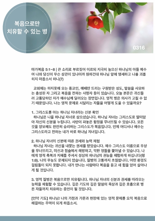 하나님 자녀는 귀신을 내쫓는 권세를 받았습니다. 예수 그리스도 이름으로 우상을 무너뜨리고, 미신과 점술에서 해방하고, 악한 영들을 쫓아낼 수 있습니다. 나에게 영적 축복과 지혜를 주셔서 성삼위 하나님의 권능을 체험하게 하십니다(행1:8). 나의 무능도 문제되지 않습니다. 질병의 고통까지 초월합니다. 어떤 환경도 걸림돌이 되지 못합니다. 내가 만나는 사람마다 복음을 듣고 새 힘을 얻어 살아나게 될 것입니다.