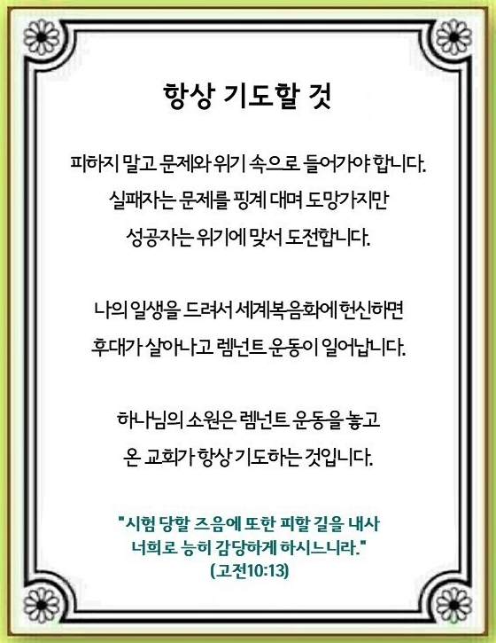 하나님의 소원은 광야 운동(신6:4~9), 미스바 운동(삼상7:1~15), 도단성 운동(왕하6:8~24), 파수꾼 운동(사62:6~12) 그리고 회당 운동(행17:1, 18:4, 19:8)을 놓고 온 교회와 현장의 중직자와 전 세계 Remnant가 항상 기도하는 것입니다.