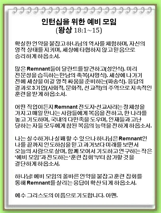 [언약 기도] 하나님! 예비 모임의 올바른 언약을 붙잡고 훈련 집회를 통해 Remnant를 살리는 응답이 확산되게 하옵소서.