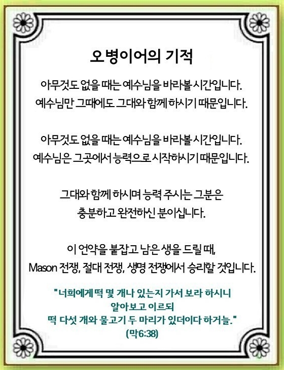 많은 사람이 예수님의 말씀을 듣다보니 저녁이 되었습니다. 이에 예수님은 딱 하나 남은 도시락을 받아들고 축복 기도를 하셨습니다. 이때 기적이 일어나 성인 남성 5천 명이 먹고도 남은 것이 열두 바구니에 담을 정도가 되었습니다. 우리 인생이 오병이어 밖에 없거나 아무것도 없는 빈손처럼 보일 그때가 예수님을 바라볼 시간입니다.