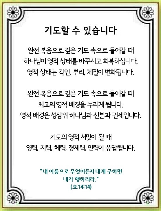 하나님의 말씀을 정확히 붙잡으면 기도가 됩니다. 참된 미션을 붙잡았기 때문입니다. 깊은 기도, 깊은 말씀, 깊은 묵상을 통해 새 힘도 얻습니다. 흔히 불신자들이 말하는 운명이 영원히 뒤바뀌는 축복입니다. 성삼위일체 하나님의 비밀뿐 아니라 하나님 자녀의 신분과 권세라는 최고의 영적 배경까지 누릴 수 있습니다.